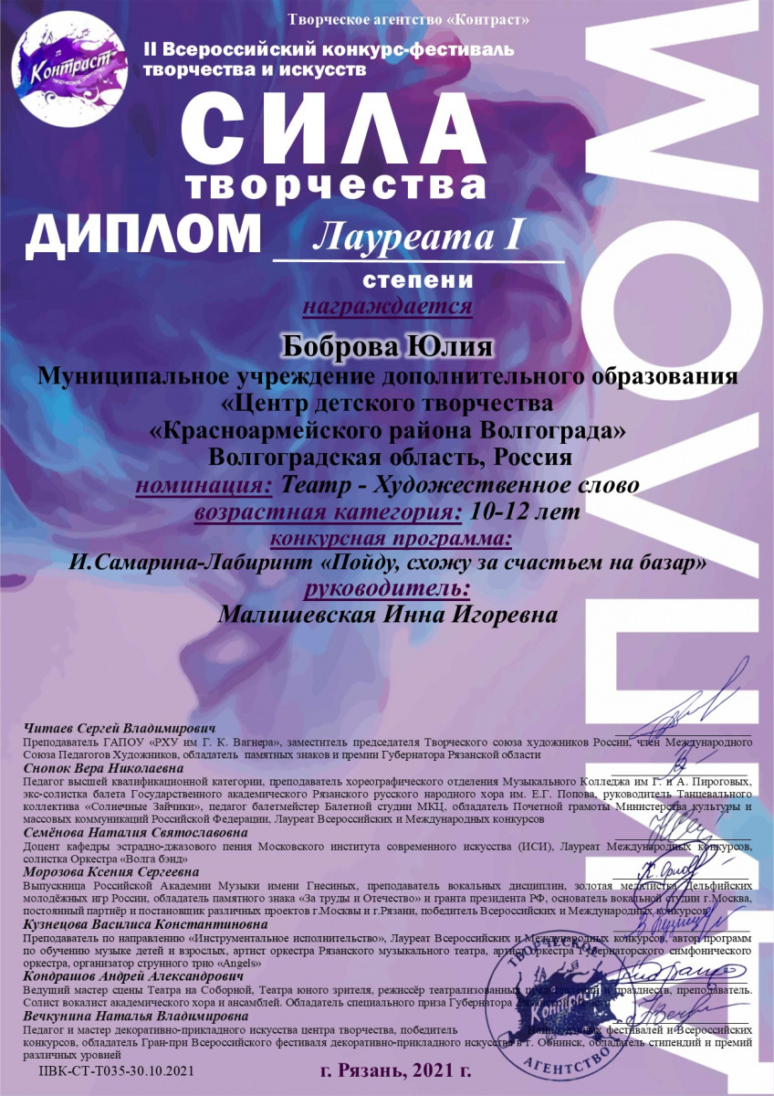 — лауреат 1 степени – Боброва Юлия, учащаяся студии шоу-программ (педагог Малишевская Инна Игоревна);