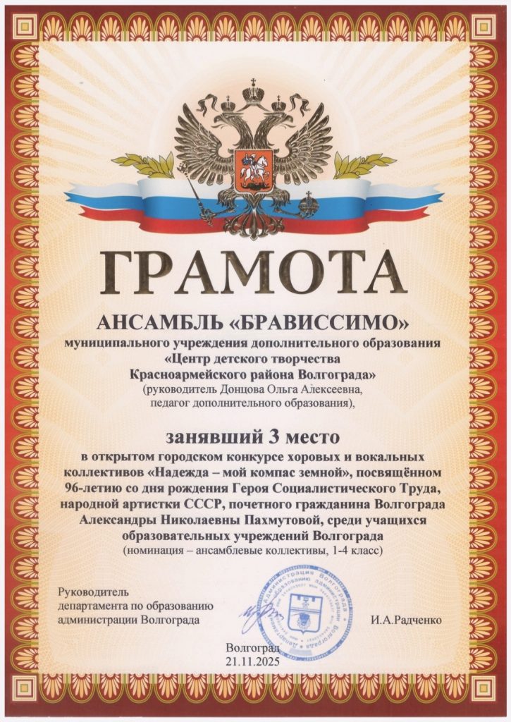 С радостью можем сообщить, что вокальный коллектив «Брависсимо» и их руководитель Донцова Ольга Алексеевна были награждены грамотой от руководителя департамента по образованию администрации Волгограда И.А. Радченко за почетное3 место